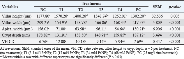 Jejunum morphometricsTable 6 showed the results of the morphometrics of the jejunum of broiler chickens, which were also confirmed in Figure 1. An increased villus height and villus height-to-crypt depth were observed by adding 8.5 ml/l PcNP to the drinking water of broiler chickens compared to other treatments (P < 0.005). The application of the entire dose of PcNP decreased the villus width, apical width, and crypt depth of broiler chickens compared with the control (P < 0.001).