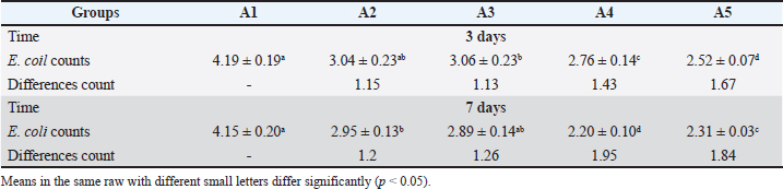 Group A5 had the greatest decrease in coliform (1.05 and 1.31 Log10 CFU/g) after 3 and 7 days, respectively, compared with the control group. Table 5 shows the decontamination effect of lactic acid and EO of rosemary and thyme on the inhibition of E. coli. The decrease in E. coli counts was significant (p < 0.05) in groups A2–A5 when compared to A1 (control group) after 3 and 7 days. The highest decrease was observed in lactic acid (A1) and the combination of rosemary and thyme (A5) (1.43 and 1.67 Log10 CFU/g) (1.95 and 1.84 Log10 CFU/g) after 3 and 7 days, respectively, but the greatest decrease was observed in lactic acid (A4) after 7 days (1.95 Log10 CFU/g) statistically (p < 0.05). Table 5. E. coli (Log10 CFU/g) decontamination results.