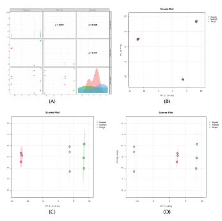 Fig. 1. PCA of sperm metabolomic profiles in Indonesian buffalo breeds. (A) Pairwise metabolite distribution plots, (B) PCA 1 versus. PCA 2, (C) PCA 1 versus. PCA 3, and (D) PCA 2 versus. PCA 3.