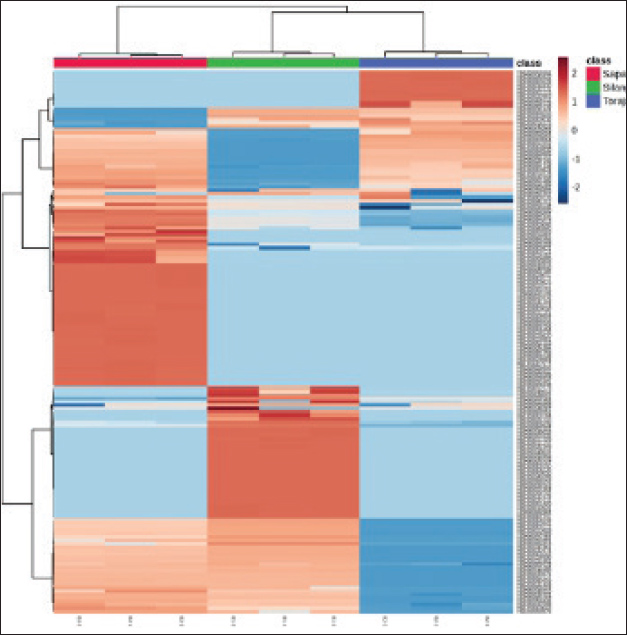 Differential metabolites in the spermHierarchical clustering heatmap analysis showed that sperm metabolomic profiles were distinctly different among Silangit, Toraja, and Sapala buffalo breeds (Fig. 3). The clustering pattern reflected clear breed-specific metabolite abundance, with groups of metabolites displaying higher or lower intensities in one breed compared with the others.