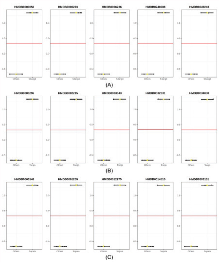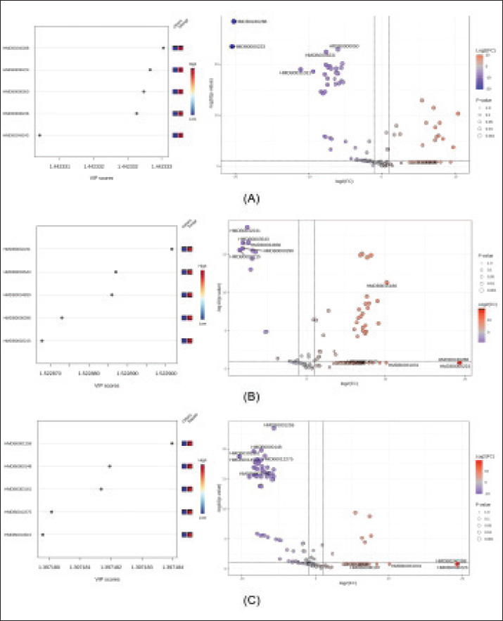 Fig. 4. Top 5 differential sperm metabolites in Indonesian buffalo breeds based on Variable Importance in Projection scores and volcano plots. (A) Silangit, (B) Toraja, and (C) Sapala. Table 3. Top 5 differential sperm metabolites in Indonesian buffalo breeds.