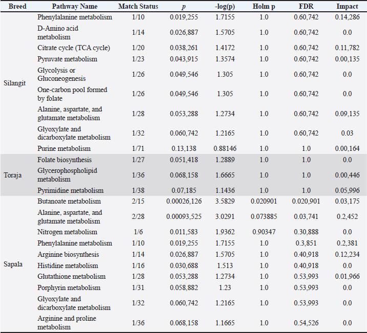 Fig. 5. Pathway enrichment analysis of differential sperm metabolites in Indonesian buffalo breeds: Silangit (A), Toraja (B), and Sapala (C). Table 4. Pathway enrichment analysis of differentially expressed sperm metabolites in Indonesian buffalo.