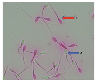 Fig. 1. Sperm viability: a) viable and b) non-viable spermatozoa. Seminal plasma protein profiling by 1D-SDS-PAGESeminal plasma was separated by centrifuging semen at 3,000 × g for 10 min at 4 °C, and protein concentrations were quantified using the Bradford assay with bovine serum albumin as the standard. For proteomic profiling, five ejaculates from each buck were pooled to generate one seminal-plasma sample per individual (three pools total) to reduce temporal variation within the animal. Each pooled sample was mixed with Laemmli buffer (1:1) and heated at 95 °C for 5 min, and 20 µg of total protein was loaded per lane. Protein separation was conducted using 1D-SDS-PAGE with a 12% resolving gel and 4% stacking gel at 60 V (stacking) and 20 mA (resolving) for ~3.5 hours. Gels were stained with Coomassie Brilliant Blue and destained until the bands were visible. A broad-range MW marker (ExcelBand 3-color PM2700, SMOBIO, Taiwan; 5–245 kDa) was included in every gel to enable MW estimation. Each pooled sample was run in duplicate as technical replicates, and two evaluators scored the band presence/absence and relative intensity independently; only matching observations were retained. Molecular-weight identification was inferred by matching band migration to the nearest marker bands using a ±5%–10% tolerance window, and proteins were therefore classified as putative identifications (Diansyah et al., 2023a). Semen collection was performed under natural tropical farm conditions (daily THI 78–84) and standardized to the morning period to minimize environmental variation that could influence seminal-plasma profiles. Bioinformatics and statistical analysesThe protein bands were annotated against the UniProt bovine protein database (http://www.uniprot.org) to assign putative identities based on molecular weights. Gene Ontology (GO) enrichment was performed to classify proteins into biological process, molecular function, and cellular component categories. To construct potential protein–protein interaction networks, pathway enrichment analyses were conducted using g:Profiler (https://biit.cs.ut.ee/gprofiler/gost). Semen quality data derived from multiple ejaculates (15 ejaculates per buck) were first summarized within the animal to avoid pseudoreplication. Batch-level measurements were averaged to generate a single animal-level value for statistical inference, and the buck was treated as the true experimental unit. Data normality was evaluated using the Shapiro–Wilk test, and variance homogeneity was assessed using Levene’s test. Differences among bucks were analyzed using one-way analysis of variance, with significance set at p < 0.05. The results are presented as mean ± SD, reflecting biological dispersion across animals. Band presence/absence and relative intensities were compared descriptively across the three pooled samples for SDS-PAGE. Ethical approvalThis study was conducted in accordance with animal welfare standards and approved by the Animal Ethics Committee of the Faculty of Animal Science, Universitas Hasanuddin (Approval No. 009/UN4.12/EC/V/2025) and conducted from May to August 2025 (≈16 weeks). ResultsSemen quality and kinematicsSperm abnormality differed among bucks (p < 0.05), with Buck 3 having higher sperm abnormality than Bucks 1 and 2 (see row superscripts). Acrosome integrity also differed (p < 0.01), with Buck 1 having lower sperm integrity than Bucks 2 and 3. In contrast, motility, viability, membrane integrity, and all kinematic parameters (VCL, VAP, VSL, LIN, STR, and WOB) were not significantly different between the two groups (all p > 0.05). Seminal plasma protein profilesA conserved core of seminal-plasma proteins was detected across all bucks, including BSP1, BSP3, GPX5, BSP5, SOD1, ANXA5, SERPINA3, ALB, HSPA1A, CLU, and HSP90AA1 (present in 3/3). Variation was confined to a small subset: LTF appeared only in Buck 2, SPP1 (100 kDa) was absent in Buck 3, FN1 (120 kDa) was exclusive to Buck 2, and A2M (150 kDa) was not detected in Buck 3. Consistent with this pattern, Buck 2 exhibited the most comprehensive repertoire, whereas Buck 3 exhibited the fewest detections. Functional enrichmentThe detected proteins were significantly enriched for extracellular space/region and vesicle-related components, with biological-process terms including regulation of multicellular organismal process and regulation of cytokine production. The mapped set predominantly comprised BSPs, ANXA5, SPP1, SERPINA3, ALB, CLU, LTF, FN1, A2M, HSPA1A, and HSP90AA1. Several detected proteins are classically linked to male fertility. SPP1 and FN1 support sperm adhesion within the female tract and engagement with the oviduct and the zona pellucida, which are processes associated with successful fertilization. The BSP family (BSP1, BSP3, and BSP5) and ANXA5 facilitate cholesterol efflux and controlled membrane remodeling that enable capacitation, whereas ALB supports this transition by acting as a cholesterol acceptor. These factors are associated with membrane stability, acrosomal competence, and effective sperm interactions with the female tract. In parallel, the profile also contains markers consistent with thermal and oxidative load typical of tropical conditions. HSPA1A and HSP90AA1 provide chaperone protection during heat and oxidative stress, with CLU contributing to extracellular chaperoning and damage control; SOD1 and GPX5 further limit reactive oxygen species to preserve motility and structural integrity. Immune and protease balance is reflected by LTF (antimicrobial, iron chelation), SERPINA3 (serine protease inhibition), and A2M (broad protease trapping), which together may curb premature acrosomal events and maintain a supportive seminal milieu. Taken together, the panel indicates a dual emphasis on fertility-supporting mechanisms and stress adaptation safeguards, which are features that are consistent with reproduction under tropical heat exposure. DiscussionThis study