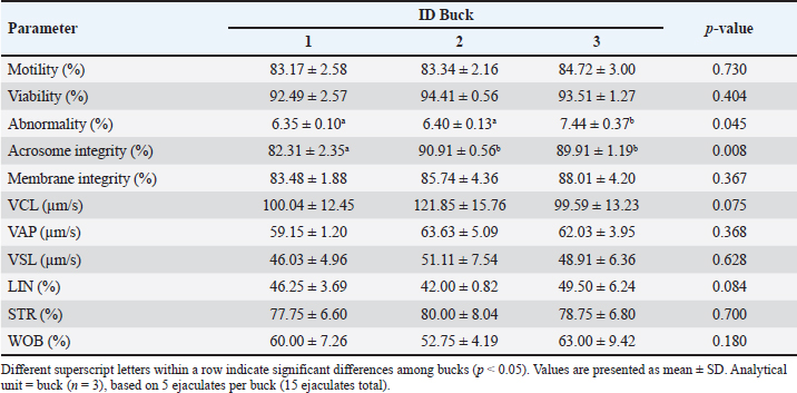 The variation across individuals was limited but biologically informative. LTF and FN1 at 120 kDa were detected only in Buck 2, whereas A2M and SPP1 at 100 kDa were not detected in Buck 3 (Table 2). LTF is linked to antimicrobial action and iron chelation with implications for membrane and acrosomal protection, FN1 contributes to adhesion within the female tract, and A2M modulates extracellular proteolysis that can influence premature acrosomal events (Verma, 2022). Although these associations are descriptive in a three-buck design, the pattern is coherent with the selective differences observed for abnormality and acrosome integrity in Table 1 and provides candidates for targeted validation. Table 1. Semen quality and kinematics of Saanen bucks.