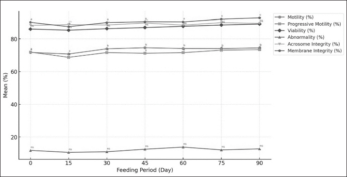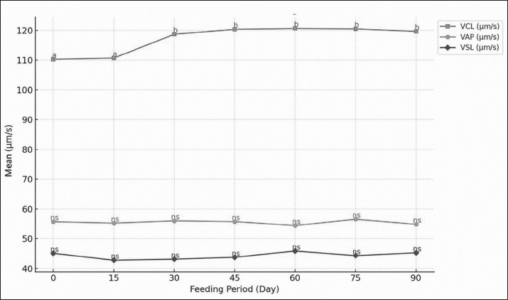 Fig. 2. Sperm velocity in Garut Rams during Azolla Pinnata feeding periods; different superscripts in the same line indicate significant differences at p < 0.05. As depicted in Figure 3, the sperm distance parameters (DCL, DAP, and DSL) were measured in Garut rams throughout a 90-day feeding regimen with A. pinnata. The graph indicates that no significant differences (ns) were observed among the various time points for all parameters. The DCL, DAP, and DSL values remained fairly consistent over the entire feeding period, with no notable changes detected at any particular time point. The feeding treatment of A. pinnata did not significantly affect the distance parameters of sperm movement during the 90-day timeframe.