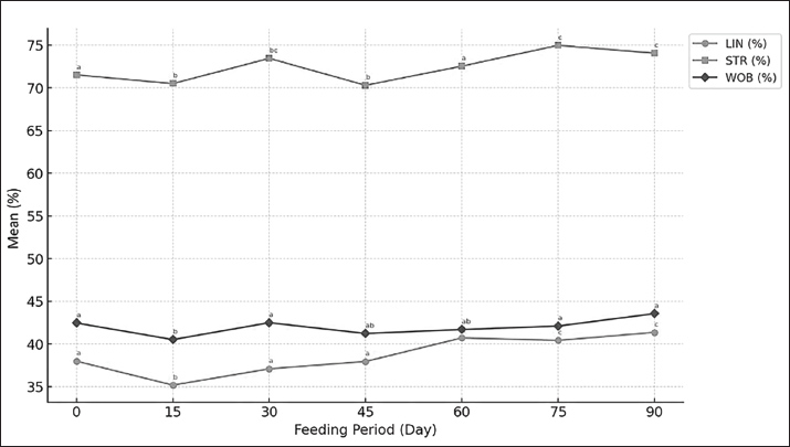 Fig. 3. Sperm distance in Garut rams during Azolla Pinnata feeding periods; different superscripts in the same line indicate significant differences at p < 0.05. Figure 4 shows the parameters of sperm motion, such as LIN, STR, and WOB, for Garut rams during a 90-day feeding period with A. pinnata. The graph reveals statistically significant differences (p < 0.05) among the days, indicated by different superscripts within the same row. Remarkable improvements in LIN were observed, with values at days 60, 75, and 90 being significantly higher than those at days 0 and 15, indicating a steady enhancement in sperm linearity after day 60. STR also showed significant variations across time, with values markedly greater at days 60, 75, and 90 than at days 0, 15, and 30, reflecting a consistent increase in sperm straightness. WOB exhibits a gradual increase throughout the feeding period, with significant differences at days 30, 60, 75, and 90 compared with day 0. The highest WOB value on day 90 indicates a substantial improvement in sperm wobble.
