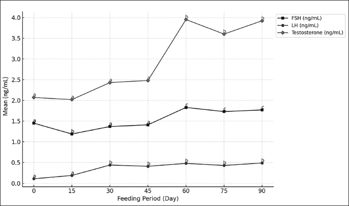 Fig. 5. Hormone level in Garut rams during Azolla Pinnata feeding periods; different superscript letters in the same line indicate significant differences at p < 0.05. Reproductive capacity in Garut rams during the feeding period of Azolla pinnataAs detailed in Figure 6, the reproductive ability, as indicated by the Service per Conception, is defined as the average number of inseminations required for an ewe to become pregnant. A total of 12 ewes were used for fertility testing, and the S/C value represents the mean fertility response corresponding to semen from each sampling period, which was monitored over a 90-day feeding period involving A. pinnata. The graph demonstrates significant differences (p < 0.05), as indicated by distinct superscripts on the same line. The service per conception value reached its highest level around day 15, with an average of approximately 2.2, which was notably higher than the values observed at later time points. On day 30, a consistent decline was recorded, with significant differences between day 15 and the subsequent days. The lowest values were observed on days 60, 75, and 90, indicating a reduction in SPC as the feeding duration progressed.