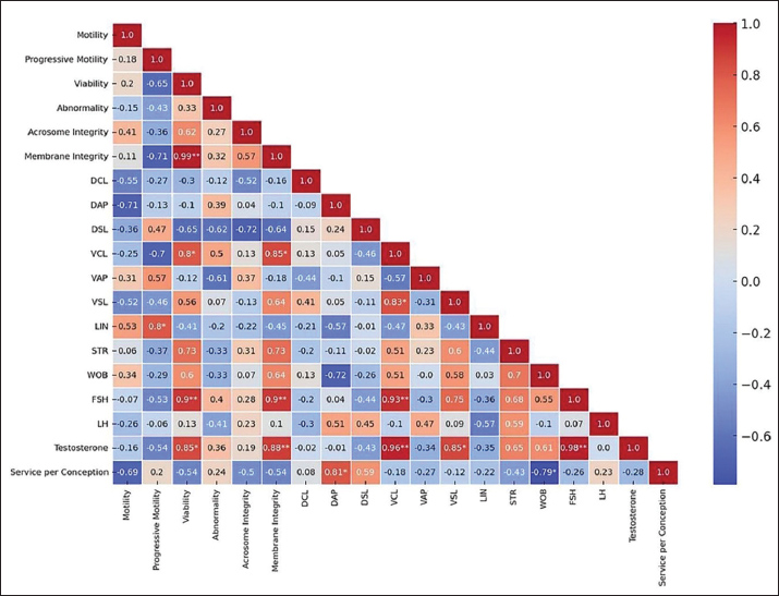 Fig. 7. Pearson correlation between all parameters in Garut rams during Azolla pinnata feeding periods. means differ significantly at p < 0.05; means differ significantly at p < 0.01. DiscussionPart rams, a local breed in Indonesia, are highly valued for their superior meat quality and reproductive traits, contributing significantly to the region’s livestock industry. It is crucial to enhance the performance of Garut rams to improve herd productivity and ensure the sustainability of livestock operations, given their critical role in small-scale farming. The ability of Garut rams to improve sperm quality, motility, and hormonal profiles is a key factor in optimizing breeding programs and ensuring better fertility outcomes (Santoso et al., 2024). Consistent with our findings on Azolla, prior studies across multiple ram breeds (e.g., Zandi, Suffolk, Afshari × Booroola Merino) reported that dietary supplementation with Saccharomyces cerevisiae, long-chain omega-3 fatty acids (fish oil), trace minerals (Zn–Mn–Cu), selenium, and phytogenic compounds (e.g., Astragalus polysaccharides) can enhance reproductive efficiency by improving semen quality (motility, viability, and membrane integrity), supporting endocrine function, and mitigating oxidative stress via improved rumen fermentation, membrane-lipid remodeling, and upregulated antioxidant defenses. Azolla pinnata supplementation resulted in significant improvements in sperm motility, progressive motility, and acrosome integrity over the 90-day feeding period. Existing literature supports the effectiveness of these improvements, which demonstrates that dietary supplementation can enhance sperm motility by providing essential nutrients needed for ATP production and membrane integrity (Rahmat et al., 2024). Sperm motility, a critical factor for fertilization, is directly related to sperm energy metabolism, which is facilitated by essential nutrients found in Azolla, such as proteins and fatty acids (Surahman et al., 2021). The observed improvement in motility is probably due to the direct impact of these nutrients on sperm functionality and fertilizing potential. Azolla Pinnata provides a dense matrix of essential amino acids, polyunsaturated fatty acids (PUFA; chiefly linoleic and α-linolenic acids), and antioxidant phytochemicals (carotenoids, flavonoids, and polyphenols) (Golzary et al., 2021). Multiple compositional surveys across Azolla species, including A. pinnata, have reported high crude protein content with balanced amino-acid profiles and measurable PUFA fractions, along with antioxidant-rich extracts (Al-Huqail et al., 2025). These constituents are relevant for sperm function because amino acids support ATP-generating enzymes and structural proteins, PUFA contribute to plasma- and acrosomal-membrane fluidity, and antioxidants buffer reactive oxygen species (ROS) that otherwise impair sperm membranes and organelles (Islam et al., 2021). However, while significant improvements in motility and acrosome integrity were observed, no significant changes in sperm distance parameters, including DCL, DAP, and DSL, were observed. This finding raises important questions about the factors that influence sperm movement. Although sperm velocity and motion are crucial for successful fertilization, they are also influenced by a range of factors beyond the sperm's intrinsic characteristics, such as the viscosity of the semen and the environment within the female reproductive tract (Van de Hoek et al., 2022). While motility directly affects the sperm’s ability to swim toward the oocyte, the distance traveled, as measured by parameters such as DCL and DSL, may be more dependent on external factors such as the uterine environment and the reproductive tract’s physiological properties (Diniz et al., 2021). These parameters are less likely to be influenced by dietary changes, especially in the short term, and a more complex interaction between sperm behavior and the female reproductive system may be required for measurable changes to occur. In terms of sperm motion, sperm velocity was also evaluated using parameters such as VCL, VAP, and VSL. Sperm velocity is a critical aspect of sperm function, as faster sperm are more likely to reach and fertilize the egg. VCL, VAP, and VSL are key kinematic parameters that reflect the speed and trajectory of sperm during movement (Al-Hadithy and Cedden, 2023). The study found a notable increase in VCL starting from day 60, with significantly higher values at days 75 and 90 compared with earlier time points. Azolla supplementation positively influenced sperm velocity, particularly curvilinear velocity, which is associated with more efficient and directed sperm movement. The increase in VCL supports the idea that Azolla supplementation provides the nutrients necessary for improved sperm motility and trajectory, as VCL is influenced by the sperm’s energy reserves and the integrity of its flagellum (Tesfa et al., 2023). In contrast, VAP and VSL did not show significant changes, suggesting that the overall movement pattern of sperm (i.e., whether they travel in straight lines or average paths) remained unaffected while curvilinear velocity improved. VAP and VSL are more reflective of sperm precision and directional swimming, which may not be as responsive to dietary changes as curvilinear velocity (Rizkallah et al., 2022). This indicates that while Azolla supplementation improves the general motility of sperm, it may not directly influence the sperm’s ability to maintain a straight trajectory or optimize their path during movement. Sperm velocity parameters, such as VAP and VSL, may depend on more complex factors, including sperm-egg interaction, environmental conditions within the reproductive tract, and the sperm’s ability to adapt to the female reproductive environment (Fernandez-Novo et al., 2021). Sperm mitochondrial membrane potential is tightly coupled with motility, capacitation, acrosome reaction, 