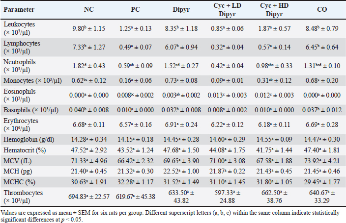 Fig. 1. Experimental design of the study. Group 1 received 0.1 ml of normal saline. Group 2 was treated with Cyc at 200 mg/kg on the ninth day. Group 3 received a dose of 30 mg/kg Dipyr for ten days. Group 4 received an oral dose of 15 mg/kg Dipyr for ten days with Cyc 200 mg/kg injection on the ninth day. Group 5 received an oral dose of 30 mg/kg Dipyr for ten days with Cyc 200 mg/kg injection on the ninth day. Group 6 served as the control group for corn oil.. Animal euthanasia and organ collectionOn the eleventh day of the experiment, the rats were anesthetized by a 0.4 ml combination of ketamine (100 mg/ml manufactured by Doga Ilac, Türkiye) and xylazine (20 mg/ml, manufactured by Beltavetpharma, Türkiye). The final solution of ketamine/xylazine contained ketamine at a rate of 33.3 mg/ml and xylazine at 6.7 mg/ml, and it was injected at a rate of 3 ml/kg. After that, the chest cavity was opened, and the animals were sacrificed by exsanguination. The collected blood was divided into two tubes for complete blood count and biochemical analyses. Then, the peritoneal cavity was opened, and the liver was collected and flushed with 0.9% NaCl solution. The livers were weighed on a sensitive balance, and 2 g of tissue was excised for homogenization by mixing with 18 ml of phosphate-buffered saline (PBS), homogenizing with a mechanical homogenizer, and then centrifuging in a cold centrifuge. The supernatant was then transferred to a separate Eppendorf tube and stored at −80 ºC until used to measure OS, antioxidants, and immunological biomarkers. The remaining liver tissue was placed in 10% formalin for histopathological processing. Body/liver weight measurementsThe rats’ body weights were measured using a digital balance on days 1, 9, and 11 during the experiment. Additionally, the freshly excised livers of sacrificed animals were weighed after washing in 0.9% NaCl solution and drying with medical gauze to determine the liver-to-body weight ratio. Biochemical analysisThe serum samples were centrifuged with a microcentrifuge (Hettich Zentrifugen EBA20, Germany). Then, serum levels of alanine transaminase (ALT), aspartate transaminase (AST), alkaline phosphatase (ALP), gamma-glutamyl transferase (GGT), total bilirubin (TB), and albumin were measured. The above-mentioned parameters were measured with Cobas C 311 (Roche/Hitachi, Switzerland). Assessment of hepatic oxidative stress and antioxidant biomarkersThe MDA (malondialdehyde) ELISA Kit was used to measure MDA levels in liver tissue. Additionally, the Rat TAC ELISA kit was used to measure TAC in liver tissue. This test helps evaluate the liver’s ability to counteract OS by neutralizing free radicals. Moreover, the Rat Glutathione (GSH) ELISA Kit was used to measure GSH levels in the liver. Furthermore, the Rat Catalase ELISA Kit was used to measure catalase enzyme levels. All kits were manufactured by Bioassay Technology Laboratory (China), and the procedures were conducted according to the manufacturer’s instructions. Measuring the nuclear factor kappa B (NF-κB) levels in the liverThe Rat Nuclear Factor Kappa B (NF-κB) ELISA kit, manufactured by Bioassay Technology Laboratory (China), was used to measure NF-κB activation levels in the liver tissue, which play a critical role in inflammation, immune response, OS, and liver disease progression. The procedure was conducted following the manufacturer’s instructions. Hematological analysisThe automated Mindray Auto Hematology Analyzer BC-2800Vet (Shenzhen Mindray Biomedical Electronics Co., Ltd., China) was used to measure hematological parameters, such as total and differential leukocyte counts, erythrocyte and thrombocyte counts, hemoglobin concentration, hematocrit, mean corpuscular volume (MCV), mean corpuscular hemoglobin (MCH), and mean corpuscular hemoglobin concentration (MCHC). Histopathological procedureThe histopathological protocol used was based on a procedure from a previous study (Arsad et al., 2014). The liver tissue was allowed to fix for more than 48 hours, as was recommended by previous studies (Ming et al., 2021). The liver samples were placed in 10% formalin and then dehydrated through a gradual increase in ethanol concentration (70%, 80%, 90%, and 100%), washed, and cleared in xylol. They were subsequently rehydrated and embedded in paraffin. Then, 5-µm-thick sections were stained with hematoxylin and eosin (H&E), cover-slipped, and examined under a standard light microscope (Motic, Japan) at various magnifications. The hepatic tissue was assessed for changes in architecture, portal triads, hepatocytes, sinusoids, inflammation, and the occurrence of degeneration, necrosis, and fatty change. The alterations were classified into the following categories: Grade 0: Unremarkable histological findings (0%); Grade 1: Mild change involving up to 25%, initiation of change; Grade 2: Moderate change involving 26–50%; Grade 3: Moderate-severe change involving 51–75%; and Grade 4: Severe change involving >75%, widespread changes identified (Hassan et al., 2022). The following lesions were considered during the histopathological examination: Swelling of hepatocytes, hydropic degeneration, congestion of central veins, congestion of portal veins, congestion of sinusoidal capillaries, and the degree of inflammation. Statistical analysisThe data of the results were expressed as the mean ± SEM. A one-way analysis of variance (ANOVA) was used to analyze parametric data, followed by Duncan’s post hoc test; the Kruskal-Wallis test was used for nonparametric data. A probability level of 0.05 was considered to determine significant differences. Ethical approvalThe College of Veterinary Medicine, University of Sulaimani, approved the study protocol through the approval number AUP-2024-32. ResultsAnimal and liver weightsThe weight of rats on day 1 of the study ranged from 194.2 g to 211.8 g, with no significant differences between the groups (Fig. 2). By day 9, their weights i