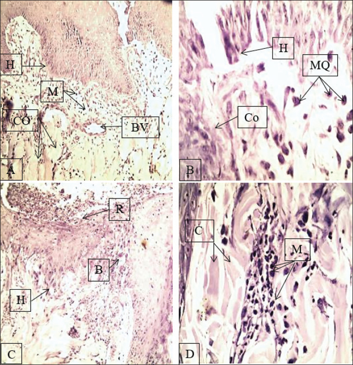 Fig. 1. Histology of the skin in the first week of the study showing the start of the sequence of events in wound repair. In G1 (A-B), the slices show a thick surface crust, granulation tissue (macrophages with collagen fibrosis), and collagen fibrosis, whereas G2 (C-D) shows crust sloughing, an organized pattern of collagen interlaced with dominant collagen and neutrophils, suggesting a more advanced stage of the stream of continuum. G=granulation tissue, B=blood vessel, F=fibrosis/collagen fibers, C=crust, S=epidermal surface, BV=blood vessel, CO=collagen, MQ=macrophages, H=hair follicle, M=muscle. A, C, 100 B, D 400. Second weekBy the second week, the histology of tissue samples from the G1 group showed moderate epidermal hyperplasia, particularly of the stratum basale. The collagen fiber bundles had an increased thickness, and new blood vessels continued to develop. The macrophages were still active in the interstitium. The wound was still not closing at the wound edges. Some signs of the inflammatory response continued. As healing progressed, more tissue regeneration appeared to be necessary for complete healing. On the other hand, the G2 samples displayed more accelerated healing. The wound surface had little remaining scab. The epidermis showed downgrowth, and the wound margins had already fused. The surface was underpinned by a dense collagen matrix, and the macrophages were still present to encourage remodeling. At higher magnification (X400), more compact and aligned collagen fibers were seen. In the second week, tissue samples demonstrated that the Fetal Calf Serum significantly advanced tissue regeneration and epidermal remodeling and enabled more rapid wound closure (Fig. 2).