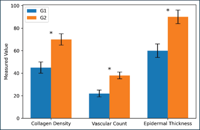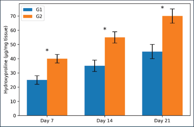 Fig. 5. Comparison of the collagen density (% area), vascular count (vessels/mm²), and epidermal thickness (µm) on day 21. G2 showed higher collagen content, more vessels, and thicker epidermis. Statistically significant differences (*p ≤ 0.05). G2 exhibited a greater hydroxyproline level in the tissue on days 7, 14, and 21. By day 21, the difference reached a statistically significant level (Fig. 6).