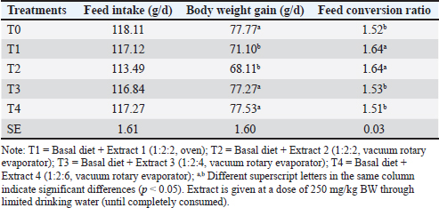 0.05) T3 (1.14%), and T4 (1.29%) lower than the other treatment (T0, and T2). Furthermore, extract composition (T3 and T4) significantly influenced (p> 0.05) weight gain (77.27 g/d, and 77.53 g/d), final body weight (1867.25 g, and 1824.75 g), feed conversion ratio (1.53, and 1.51), and abdominal fat (1.14%, and 1.29%), but not feed intake or carcass yield (p < 0.05). Conclusion: These findings highlight the potential of Cinnamononi extracts, particularly from techniques 3 and 4, as effective natural feed additives for broiler production."/>