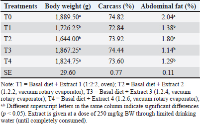 Table 4. Effect of treatment on body weight, carcass percentage, and abdominal fat of broiler.