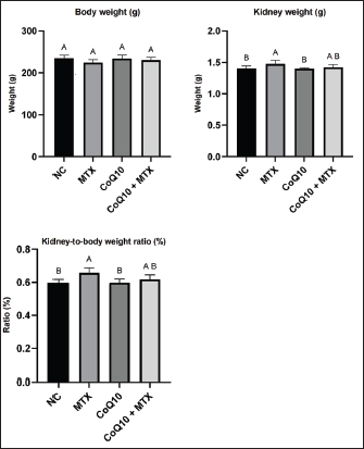 Fig. 2. The body weight, kidney weight, and KBW ratio in the various experimental groups. Values represent the mean (columns) ± SD (error bars) for six rats per group. Different uppercase letters indicate significant differences at p < 0.05. The KBW ratio provides a more concise indicator of changes in kidney size to account for body mass differences. The average KBW ratio of the NC was 0.598%, while that of the PC was 0.658%, reflecting a 10% increase compared with that of the NC (Fig. 2). Coadministration of CoQ10 resulted in a KBW ratio of 0.618%, which was not significantly different from that of the NC, supporting the notion that CoQ10 has a protective role against MTX-induced hypertrophy. BUN, creatinine, UA, and urinary NAGThe NC group exhibited a baseline BUN of 25.8 mg/dl, which was not significantly different from that of the CoQ10-only treated group (Fig. 3). In contrast, the PC group had a BUN level of 39.0 mg/dl, which was approximately 51.2% higher than that of the NC group, indicating renal stress or dysfunction. CoQ10 coadministration lowered the BUN level to 30.2 mg/dl, which was not significantly different from that of the NC group, highlighting the renoprotective effects of CoQ10.