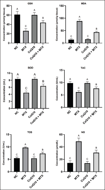 Fig. 4. GSH, MDA, SOD, TAC, TOS, and NO levels in the different experimental groups. Data are shown as mean (columns) ± SD (error bars) for six rats per group. Distinct uppercase letters indicate statistically significant differences at p < 0.05. Increased MDA levels in renal tissues are widely recognized as indicators of OS, lipid peroxidation, and potential nephrotoxicity. In this group, MDA concentrations were elevated 6.48-fold, rising from the baseline 13.6 µmol/g tissue in the NC to 88.1 µmol/g (Fig. 4). This remarkable increase in MDA in the PC group reflects potential oxidative damage to kidney tissue, indicating possible renal impairment. Coadministration of CoQ10 with MTX significantly reduced MDA concentrations to an average of 43.5 µmol/g, which was significantly lower than that of PC. However, the combination could not restore the MDA values to those observed in the NC group. Nevertheless, this finding reflects the potential of CoQ10 to reduce OS and lipid peroxidation and mitigate MTX-induced renal injury. SOD is an essential enzymatic antioxidant that catalyzes the dismutation of superoxide radicals into oxygen and H2O2. In this study, a lowered SOD concentration by 47.6% in the PC group from the baseline 8.4 U/l in the NC group to 4.4 U/l is an indication that MTX weakened the renal tissue’s capacity to neutralize ROS, leading to increased OS and potential renal injury. CoQ10 alone in group 3 did not alter SOD levels, whereas coadministration with MTX in group 4 increased the enzyme’s concentration to 6.4 U/l, significantly higher than that of the PC group but still lower than the baseline value in the NC group (Fig. 4). Altogether, these findings imply that CoQ10 mitigates MTX-induced OS, although it could not restore SOD enzymatic activity. The TAC of the renal tissue in the NC group averaged 9.8 U/ml, similar to that of the CoQ10-only group (Fig. 4). The treatment significantly reduced t by 36.7%, reaching 6.2 U/ml. Coadministration of CoQ10 with MTX elevated the TAC to 7.6 U/ml, which was significantly higher than that of the PC but still lower than the baseline value of the NC. These findings underscore the potential antioxidant effect of CoQ10 and its ability to counteract MTX-induced OS. The TOS in the PC group was higher than that in the NC group by 76.4%, indicating that the cumulative effect of ROS and other pro-oxidants was significantly higher in the MTX-only group than in the NC group (Fig. 4). In contrast, the TOS in the CoQ10 + MTX group averaged 7.3 U/ml, indicating that the combination lowered TOS levels by 24.7%, even though it failed to restore them to baseline levels observed in the NC group. This outcome further highlighted CoQ10’s potential antioxidant effect in mitigating MTX-induced OS. The NO levels were elevated about 3.4-fold from the baseline 14.2 µmol/l in the NC to 48.9 µmol/l in the PC group, indicating glomerulonephritis and drug-induced nephrotoxicity. Coadministration of CoQ10 remarkably reduced NO levels to 30.8 µmol/l (Fig. 4). This outcome further confirmed the antioxidant and renoprotective potential of CoQ10 in this study. IL-1β, TNF-α, and NF-κBThe levels of IL-1β, TNF-α, and NF-κB were significantly elevated in the PC group than in the other groups, suggesting increased inflammation and immune activation, which are typically associated with tissue injury and disease progression. Coadministration of CoQ10 with MTX in group 4 significantly reduced these values, although they did not return them to the baseline levels of the NC group (Fig. 5). These findings highlight the remarkable anti-inflammatory effect of CoQ10, although it failed to maintain the values within the baseline ranges.