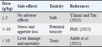 Studies have indicated that garlic extract contributes to immune system strength and growth promotion by improving gut microbiome health and physiological function (Valenzuela-Gutiérrez, 2021; Al-Hasson et al., 2025). Turmeric (Curcuma longa) and its active component curcumin have also drawn attention since 2017. Abdel-Tawwab et al. (2017) reported that curcumin supplementation at doses of 200–400 mg/kg was able to significantly enhance non-specific immunity and resistance to infection caused by Aeromonas hydrophila. Additional evidence corroborates the potent antioxidant effect of curcumin, reduction of oxidative stress, and ability to boost Nile tilapia production (Mahmoud et al., 2017; Al-Niaeem et al., 2025). Recent research has highlighted the potential of curcumin in red tilapia diet, improving growth, blood parameters, and liver function, thereby positioning it as a promising natural alternative to chemical stimulants (Radwan, 2024). Aromatic herbs such as thyme (Thymus spp.) have also been shown to be effective in fish health management. Active compounds such as carvacrol and thymol demonstrate improvement in immune response and reduction in oxidative stress when used in freshwater species such as trout and tilapia between 2018 and 2022. Low doses ranging from 0.5 to 2 g/kg were consistent in delivering stable results (Hafsan, 2022). Additionally, peppermint (Mentha spp.) has proven effective in enhancing appetite and stabilizing the intestinal microbiome, with recent findings highlighting improved growth rates and disease resistance following supplementation over a period of 30–45 days (Zahran, 2020). Studies on basil (Ocimum basilicum) emphasize its versatility in aquaculture applications. Eugenol-rich extract from basil has been shown to improve growth and immunity in trout, besides serving as a naturally sedative during fish transport, a beneficial trait for farm operations (Noorbakhsh, 2024). Similarly, coriander (Coriandrum sativum), known for its linalool content, has a notable advantage in enhancing the immune system and reducing bacterial infection in tilapia through dietary supplementation (Das et al., 2023; Said, 2023). Several studies (2019–2024) have shown that black seed (Nigella sativa) and its thymoquinone compounds play a prominent role in increasing immunity efficiency and reducing inflammation, while improving growth rates in different fish species (Alberts et al., 2024). Based on the above, the period between 2015 and 2025 witnessed an accumulation of knowledge about the importance of medicinal plants in aquaculture, with most studies agreeing that the optimal dosage ranges from 0.5 to 3 g/kg feed for 30–60 days. However, some variability in the results was due to differences in preparation and extraction methods, the fish species studied, and rearing conditions. Therefore, further long-term studies are needed to accurately determine the optimal dosages, standard preparation protocols, and chemical characteristics of extracts, especially in commercial production settings. In general, studies have concluded that whole medicinal plants and concentrated extracts have multifaceted positive effects on fish, including immunity, gut health, and growth. However, appropriate dosages must be selected to avoid toxic effects at higher concentrations. The results of recent studies also indicate that medicinal plants and extracts provide an effective and sustainable biological solution to improve fish health in aquaculture systems, as they combat pathogens, enhance innate immunity, improve digestion, reduce the need for antibiotics, and limit their associated health and environmental risks (Zahran, 2020; Tadese et al., 2021; Valenzuela-Gutiérrez, 2021; Yılmaz and Tan, 2023; Kadhim et al., 2023; Al-Turaihi and Al-Niaeem, 2024; Alberts et al., 2024; Radwan, 2024; Sumana et al., 2025; Abu-Zahra et al., 2025). However, there are clear differences in efficacy depending on the plant type, supplement form (whole plant or extract), concentration used, and target fish species. Concentrated extracts, such as curcumin and garlic, typically exhibit stronger immune-boosting effects, but they require careful dosage adjustment to avoid toxicity or side effects (Yılmaz and Tan, 2023). Factors affecting the use of plants and plant extracts as fish immunostimulantsRecent evidence indicates that the effectiveness of medicinal plants and plant extracts as nutritional and immunological additives in aquaculture largely depends on the plant variety, the plant type, the parts used, such as leaves, roots, or seeds, and the extraction method. These factors affect the concentration of active compounds and, consequently, the plant’s biological efficacy (Tables 4–8) (Dadras et al., 2023; Yılmaz and Tan, 2023). Determining the optimal dosage is essential for achieving the desired benefits, as excessive doses, especially when using concentrated extracts, can lead to toxic effects in fish (Chahardehi et al., 2020; Yılmaz and Tan, 2023; Grădinariu et al., 2025). Among the most prominent active compounds that play a pivotal role in stimulating the immune response and improving growth and disease resistance are allicin in garlic, curcumin in turmeric, and phenols and volatile oils in thyme (Tadese et al., 2021). These plants play an important role in improving the intestinal microbiome of fish by enhancing digestion efficiency, nutrient absorption, and overall digestive health (Syed Hasani, 2022). Plant extracts play a vital role in enhancing the non-specific immune response of fish by stimulating certain degradative enzymes, such as lysozyme, and boosting antioxidant molecules such as superoxide dismutase (SOD) and catalase (CAT). In addition, studies have shown that these extracts provide antioxidant effects that reduce the accumulation of free radicals and oxidative stress, thus supporting fish growth and improving their ability to cope with environmental and infection stresses. From an