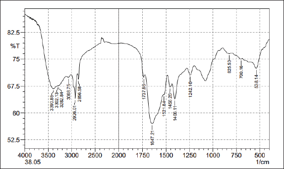 FTIR analysisThe FTIR spectrum determined the functional groups (Table 2 and Fig. 5). The alkene C=C stretching mode was responsible for the prominent peak observed at 3,390.86–3,282.84 cm−1. Crystallographic O-H stretch or alcohol molecules were likely present based on the peak characteristics at 2,926.01–2,856.58 cm−1. The broad peak at 1,647.21 cm−1 is credited to the extending mode of the N–H bend and C=C stretch (Amine, Alkene). Other crests found: The peak 1,406.11 cm−1 extending mode of the C–H bend (Alkane). The frequency 1,242.16 cm−1 extending mode of the C–O stretch (Alkyl aryl ether). The frequency 538.14 cm−1 extending mode of the C–Br stretch (Metal Oxide). Based on the peak value of the IR radiation region, the FTIR spectrum was used to determine the functional group of the active chemical in the pigment extracts. After determining the functional groups of the pigment extracted from R. platicola, the pigment (Fig. 6) was approximately 0.83 g/400 ml (Padhan et al., 2021).