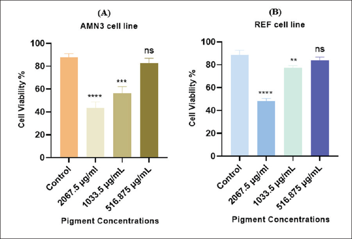 Fig. 7. Cell viability (%) of microbial-extracted pigment against A) AMN3 and B) REF cell lines at 72 hours. * Statistically significant difference compared with the untreated (control) group for each cell line (p < 0.05), is: not significant. Table 3. Cytotoxic effect of extracted pigment on AMN3 proliferation (cell viability%) at various concentrations.