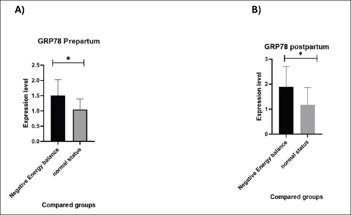 Results: The results of our study revealed that β-HB concentrations are higher significantly (p=0.0001) in NEB than in normal-status cows, both prepartum and postpartum. Similar results were observed regarding NEFA concentration in NEB compared with that in normal-status cows. However, this increase in NEFA concentration did not reach a significant level both prepartum (p=0.100) and postpartum (p=0.141). In addition, NEB cows showed significant downregulation of IL-15 expression levels (p=0.003) compared with normal-status cows postpartum. There were no significant (p=0.934) differences in IL-15 expression levels between the two groups prepartum. Furthermore, the results showed that GRP78 expression levels were significantly upregulated in NEB compared to normal-status cows both prepartum (p=0.010) and postpartum (p=0.034).