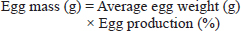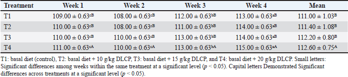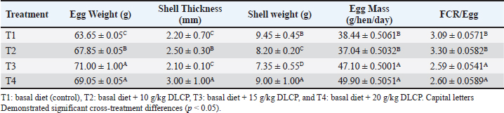 Evaluation of egg qualityThe estimation of egg quality involved evaluating 10 eggs per treatment group collected at random and stored overnight at 30°C, weighing them, and taking internal measurements (yolk height, albumen height, shell thickness) in addition to external parameters (egg weight, yolk weight, albumen weight, and shell weight). Egg weights were recorded individually using an analytical balance (Model AB204-S, Mettler Toledo, Switzerland). For internal quality, eggs were broken on a flat glass plate (25 × 25 cm) to measure. The albumen height was taken at the thick albumen with the help of a digital caliper (Model CD-6 C, Mitutoyo, Japan). The yolk was separated, weighed, and then the medium height was recorded. To assess external quality, shell thickness was measured at three equatorial locations of the egg (after membrane removal) with a digital caliper described above. Statistical analysisStatistical analyses were conducted at the pen level using the GLM procedure (SAS, 2009). Data are presented as means ± SE, and treatment effects were considered significant at P < 0.05. Ethical approvalNot needed for this study. ResultsEgg production ratesThe laying rates of hens fed 15 and 20 g/kg DLCP (T3 and T4) were significantly higher than those of the control group (T1), and the egg production value was significantly higher in hens fed 10 g/kg DLCP (T2). Production was fairly constant over the 4-week experimental period, and no significant differences were observed between any of the treatments on a weekly basis. The highest enhancement of production was observed in T3 and T4, confirming a positive reaction toward the increase of DLCP inclusion compared with that produced from T1 and T2. Feed consumptionFeed intake is presented in Table 3 because there was a gradual increase in the different habits from weeks 1 to 4. The DLCP level T4: birds had the highest feed intake in general, followed by T3, T2, and T1. For each treatment, the intake at week 4 was significantly higher than in previous weeks. This reflects a general trend of increasing feeding behavior with DLCP supplementation, particularly at 20 g/kg, which has a favorable impact on total feed intake. Table 3. Effect of graded DLCP levels on the feed intake (g/hen/day) of spent laying hens over 4 weeks.