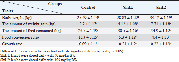 Experimental design and treatments18 female Awassi lamb were randomly distributed into three equal groups (6 ewes/ group). In control group, lambs were fed standard concentrated diet without any adding. For the 1st treated group (Shil.1), lambs were dosed daily with 50 mg/kg BW/lamb. 2nd treated group (Shil.2), lambs were fed daily with 100 mg/kg BW/lamb. Blood samplesEspecially at the onset, mid, and endpoint of the think about, blood samples for haematological measurements are taken from the jugular vein utilizing a non-essential 5 ml size sterilised syringe. Each sample of blood was put in test tubes devoid of anticoagulant and centrifuged under standard ambient conditions for roughly 15 minutes. Serum samples are kept at the point of collection, achieved through centrifugation for a duration of 15 minutes at a rotational speed of 3,500 rpm. Samples were at that point divided into the smallest tests and scattered in sterile test tubes. Biochemical parameters were measured in the serum samples using standardized methods: Blood glucoseDetermined spectrophotometrically using the glucose oxidase-peroxidase method. Total protein and albuminQuantified using the Biuret method and bromocresol green dye-binding method, respectively. International Federation of Clinical Chemistry recommendations are used to measure liver enzymes such as Aspartate Aminotransferase (AST) and Alanine Aminotransferase (ALT) through kinetic assays. The analysis of cholesterol and lipids was carried out using individual enzymes from Cholesterol oxidaskates and Glycerol-3-phosphate oxase, with the use of certified reference materials and standard benders to ensure the highest level of precision. Measure accuracy was validated through the use of commercially accessible control sera, which were tested in nearby areas with typical and neurotic ranges. Even with some changes in the coefficients, they all stayed below 5% for both the coefficient of variation and the Connect- and Intra-Assay results, which we monitored carefully. We also made sure to regularly maintain the spectrophotometers and computerized analyzers. Dazzle reproducible: a copy of a subset of tests was replicated to verify their accuracy. These protocols were established in an accredited laboratory and adhered to the International Council for Harmonisation guidelines. A completely randomized one-way design was used to analyze the data. For post-hoc analysis, Duncan’s multiple range test was used after a one-way ANOVA (Duncan, 1955) to determine the significance of differences between groups. Using the Shapiro-Wilk test, we tested for normality while using Levene’s test to determine the similarities in variance. A Bonferroni correction was utilized to manage Type I errors by accounting for multiple comparisons. In (SAS, 2012) report it was determined that a p-value below 0.05 was statistically significant. Ethical approvalNone of the experimental animals were mistreated or euthanized, and all requisite breeding supplies and resources were supplied to ensure their welfare throughout the study duration. ResultsProductive traitsIn Table 2, Shilajit supplementation has been found to significantly improve productive traits in the current study, especially at the 100 mg/kg BW dose (Shil.2) compared with control, Body weight increased progressively across treatment groups: Control (25.49 ± 1.14 kg), Shil.1 (28.83 ± 1.22 kg), and Shil.2 (33.12 ± 1.19 kg), representing a 29.9% improvement over control. Shil.2 lambs exhibited a similar weight gain pattern, attaining 7.71 ±1.18 kg while their controls gained 2.7 ±1.17 kg. The feed conversion ratio decreased substantially from 11.3 ± 1.15 in the control group to 4.4 ± 1.13 in Shil.2. Table 2. Effect of Shilajit concentrations on some productive traits at the end of experiment (Mean ± SE).