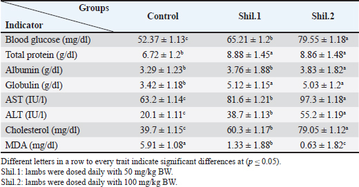 While pulse rate fell from 76.25 ± 1.41 in control to 73.2 ± 1.73 pulses/minute in Shil.2 (4.0% reduction), respiratory rate showed the most notable decrease from 56.41 ± 1.22 in control to 44.6 ± 1.23 cycles/minute in Shil.2 (20.9% drop). Biochemical parametersThe results from Table 5 show that Shilajit supplementation at 50 and 100 mg/kg BW resulted in significant (p ≤ 0.05) changes in multiple physiological measurements. The blood glucose levels showed a direct relationship with the dose which resulted in control group values of 52.37 ± 1.13 mg/dl but Shil.1 group values reached 65.21 ± 1.20 mg/dl and Shil.2 group values reached 79.55 ± 1.18 mg/dl. The treated lambs showed increased metabolic activity because their blood glucose levels rose in a straight line. Total protein values were significantly higher in both treatment groups (8.88 ± 1.45 and 8.86 ± 1.48 g/dl) compared to the control (6.72 ± 1.2 g/dl). The albumin levels in patients reached their peak at 3.83 ± 1.82 g/dl during the Shil.2 period. The globulin levels in both treatment groups experienced major increases which resulted in 5.12 ± 1.15 g/dl in Shil.1 and 5.03 ± 1.20 g/dl in Shil.2. The body shows better protein metabolism and stronger immune system function according to these changes. Liver enzymes AST and ALT demonstrated dose-dependent elevations, with AST increasing from 63.2 ± 1.14 IU/l in the control to 97.3 ± 1.18 IU/l in Shil.2, and ALT rising from 20.1 ± 1.11 IU/l to 55.2 ± 1.19 IU/l. Cholesterol levels exhibited dose-dependent increases from 39.7 ± 1.15 mg/dl in the control to 79.05 ± 1.12 mg/dl in Shil.2. Table 5. Effect of Shilajit concentrations on some biochemical parameters (Mean ± SE).