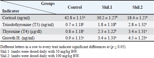 The Shilajt extract demonstrated powerful antioxidant properties through its ability to decrease malondialdehyde (MDA) levels from 5.91 ± 1.08 mg/dl in controls to 0.63 ± 1.82 mg/dl in Shil.2. Hormonal parametersThe results in Table 6 show that both Shilajit doses resulted in significant (p ≤ 0.05) changes to essential endocrine markers which directly correlated with the dosage strength. Cortisol levels showed a tremendous dose-dependent decrease from 42.8 ± 1.15 ng/ml in the control to 30.2 ± 1.27 ng/ml in Shil.1 and 18.4 ± 1.27 ng/ml in Shil.2, indicating significant stress reduction in treated animals. Thyroid hormones exhibited dose-dependent increases with Shilajit supplementation. Triiodothyronine (T3) concentrations rose from 0.7 ± 1.18 ng/ml in the control to 1.8 ± 1.18 ng/ml in Shil.1 and 2.8 ± 1.32 ng/ml in Shil.2. Similarly, thyroxine (T4) levels increased from 0.8 ± 1.18 μg/dl in the control to 2.3 ± 1.22 μg/dl in Shil.1 and 3.4 ± 1.31 μg/dl in Shil.2, indicating enhanced thyroid function and metabolic activity. Growth hormone (GH) concentrations showed the most pronounced response, increasing from 0.9 ± 1.15 ng/ml in the control to 3.4 ± 1.31 ng/ml in Shil.1 and 4.5 ± 1.23 ng/ml in Shil.2. Table 6. Effect of Shilajit concentrations on hormonal parameters at the end of experiment (Mean ± SE).