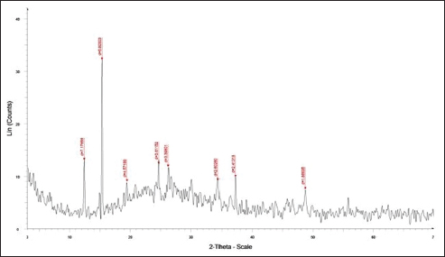 DLS showed that the average size distribution range of ChNPs was 20.1–75.2 nm. The results of the elemental EDAX analysis are displayed in Table 4 and Figure 3. Meanwhile, the XRD analysis showed a stronger peak at a maximum reflection at 13.1 (32.2 count/s) (Fig. 4).