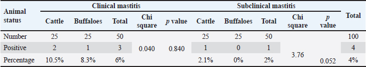 Table 2. Prevalence of Salmonella spp recovered from milk samples of cattle and buffaloes with clinical and subclinical mastitis.