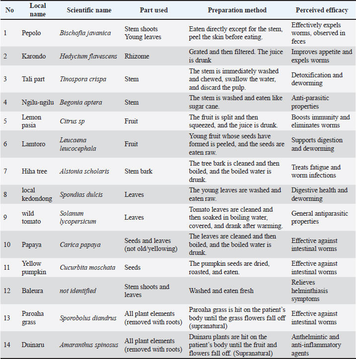 AbstractBackground: The highland community of Napu in Poso Regency, Central Sulawesi, possesses unique traditional and supernatural knowledge and practices for managing helminthiasis, locally known as Kekaindoro. Helminthiasis is considered a dangerous condition, even though it does not directly cause death. Aim: This study aimed to explore the community’s understanding of helminthiasis, their use of medicinal plants (MPs), and perceptions of the efficacy of these treatments. Methods: A cross-sectional study design was employed, with data collected through in-depth interviews. Qualitative ethnomedicine data provided insights into the helminthiasis concepts of the community, their use of traditional treatments, and the cultural practices associated with their application. Results: The Napu community links helminthiasis to barefoot activities in fields, gardens, or ditches, allowing worms to penetrate the skin. Fourteen local MP were identified as treatments: Pepolo, Karondo, Tali Pahit, pumpkin, wild tomato, local kedondong, Hiha tree, Duinaru, Bleura, Paroaha, lamtoro, lemon pasia, papaya, and ngilu-ngilu. These plants are consumed raw, boiled, or juiced, with Pepolo being the most common because of its availability and effectiveness, as evidenced by worm expulsion in feces. Traditional knowledge is passed down orally without standardized dosages or guidelines. While the community views MP as safer than modern drugs, younger generations are shifting toward modern medicine for convenience. Conclusion: This study highlights the diverse traditional plant-based practices used by the Napu community to manage helminthiasis, despite the lack of standardized dosing and timing. Scientific evaluation of these plants is needed to confirm their efficacy and inform their integration into evidence-based control efforts. Keywords: Anthelmintic, Ethnobotanical, Helminthiasis, Schistosomiasis, Traditional medicine. IntroductionHelminthiasis remains a significant health issue, particularly in rural and remote areas, such as the Napu Highlands (Edoa et al., 2024). The World Health Organization (WHO) estimates that over 1.5 billion people are infected with helminths, with high prevalence rates in developing countries. In Indonesia, helminthiasis continues to be a public health concern, especially in regions with limited access to healthcare facilities and adequate sanitation (Lee et al., 2023). The prevalence of soil-transmitted helminth (STH) in Indonesia is 28.12%. Higher rates have been reported in Papua, reaching 50% in school-age children in Jayapura (Wardani et al., 2022) and 33.8% in Central Java (Kurscheid et al., 2020). Studies in Central Sulawesi and Donggala have reported prevalence rates of 31.6% and 17%, respectively (Chadijah et al., 2014; Samarang et al., 2016). Geographical conditions, suboptimal hygiene practices, and low community awareness of the dangers of helminthiasis exacerbate infection rates in the Napu Highlands (Legesse and Babanto, 2023). Previous studies reported a prevalence of 12.24% of STH infections in the Napu community, with schistosomiasis at 4.62% and a co-infection rate of 1.9% (Nurwidayati et al., 2015). The impact of helminthiasis on public health is severe, particularly in children (Weatherhead et al., 2017). Helminth infections can impair growth and development, anemia, and malnutrition, resulting in reduced learning capacity and productivity (Ngegba et al., 2023). In adults, helminthiasis can hinder work performance and deteriorate the overall quality of life. Therefore, integrated efforts for controlling and treating helminthiasis are essential. Public education, improved access to treatment, and improved sanitation are crucial steps to eliminate helminthiasis and enhance public health in the Napu Highlands. According to the WHO, approximately 80% of the population in Asia and Africa relies on traditional medicine. The WHO recognizes that traditional medicine can address various infectious, acute, and chronic diseases, as knowledge about traditional remedies is continuously passed down through generations (Leonti and Casu, 2013). In modern Indonesia, the use of traditional herbal medicine is predominantly focused on ready-to-use herbal products. According to Basic Health Research (2018)48% of Indonesians use ready-made herbal formulations, 31.8% prepare their own herbal remedies, and 24.6% utilize medicinal plants (MP) as alternative treatments (Suganda et al., 2018). The use of herbal-based medicines is increasing globally, yet it contrasts with the declining public interest in independently cultivating or producing herbal remedies (Enioutina et al., 2017). Knowledge passed down through generations forms unique local wisdom within communities. Indonesia is an archipelagic country with an area of 9 million km2 and a total of around 17,500 islands, making it a megabiodiversity country. A study of the flora of this country states that an estimated 25% of the world’s flora is in Indonesia, which ranks seventh. Approximately 40% of them are native plants of Indonesia (Kusmana and Hikmat, 2015). The large number of tribes or ethnicities that utilize biodiversity has great potential (Nugroho, 2017). The use of traditional medicine is knowledge that has been passed down from generation to generation and is still maintained. The Napu tribe, also known as the Pekurehua tribe, inhabits the Napu Valley (North Lore) area of Poso Regency, Central Sulawesi, and still uses many traditional medicines and treatments to overcome their health problems (Adhil M Iqbal and Ramadanil, 2019). In Indonesia, approximately 7,000 plant species with medicinal properties have been recorded (Navia et al., 2022). Through the Research on MP and Jamu, the Health Research and Development Agency has documented the use of MP by various ethnic groups in Indonesia. However, data on alternative treatments for helminthiasis, particularly in schistosomiasis-endemic areas, remain scarce (van Wyk and Pr