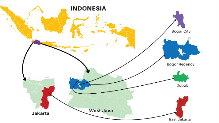 This cross-sectional study was conducted between April and June 2025 in peri-urban dairy farming areas of the Greater Jakarta region, Indonesia, including Bogor Regency, Bogor City, and Depok, (Fig. 1). Locations were selected based on high dairy cattle density and diverse management practices typical of peri-urban production systems (Al Zahra et al., 2024). This study used a cross-sectional design to estimate the prevalence of SCM at the cow level and identify farm-level biosecurity practices associated with SCM severity. As an inherent limitation, cross-sectional studies allow only the identification of associations rather than causal relationships because exposure and outcome are measured at a single time point. The cross-sectional design was chosen to provide rapid baseline epidemiological information and to generate preliminary evidence to guide future longitudinal or intervention studies.