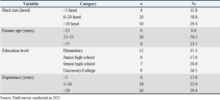 Most farmers were in the productive age group of 41–55 years (72.4%), with a predominance of low educational attainment; nearly half (48%) had only completed elementary school, and only 7% had tertiary education. Farming experience varied, with most farmers having 5–20 years (52.9%), followed by those with more than 20 years (29.4%), while only 17.6% had less than 5 years. This predominance of moderately experienced farmers is consistent with previous findings in Bogor, where experience significantly influenced farmers’ knowledge, attitudes, and practices in livestock disease control programs (Kustiningsih et al., 2023).