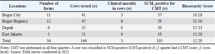 The sample size was relatively small (34 farms and 144 lactating cows), and all the sites were located in the peri-urban areas of Greater Jakarta. Therefore, the findings may not be fully generalizable to rural dairy systems or larger commercial operations. Farm-level characteristics such as access to veterinary services, labor availability, economic constraints, and cow genetics were not captured, limiting the ability to account for all relevant factors influencing udder health (Gilbert et al., 2021).