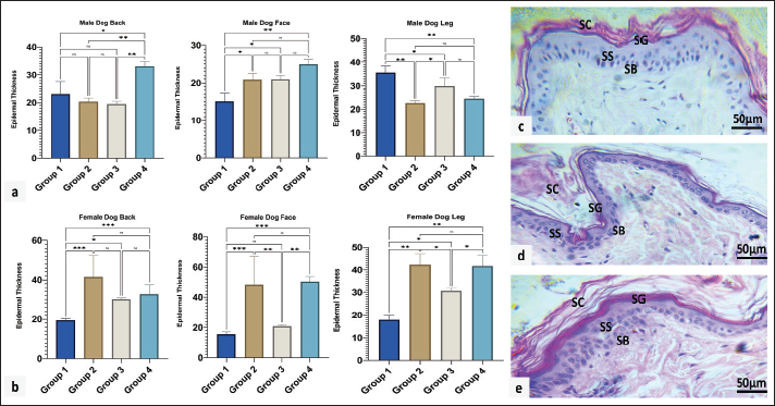 Fig. 3. Mitotic count in male (a) and female (b) dogs of different ages. Group 1 (6 month-1 year), Group 2 (1–2 years), Group 3 (2–4 years) and Group 4 (4–6 years). Data are mean ± SE; one-way ANOVA was used. Significance: (p ≤ 0.05), * (p ≤ 0.0332), ** (p ≤ 0.0021). Variations in epidermal thicknessSkin histologyThe skin of dogs showed a thin epidermis with few epidermal papillaes. The dermis is composed of papillary and reticular layers, where numerous compound hairs are found. A few sweat and sebaceous glands were found in association with hair follicles. The skin of all different regions (back, face, and leg) was composed of at least two to four well-defined nucleated epidermal layers. The canine skin was divided into four layers, including the stratum (s.) basale, s. spinosum, s. granulosum, and keratinized epidermis (SC). The dermis contained a matrix of connective tissue and epidermal appendages, such as hair follicles, sebaceous glands, apocrine glands, exocrine glands, and a few mononuclear cells (Fig. 4c–e)