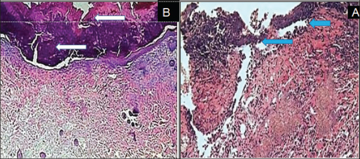 Fig. 4. Histopathological section, at 14 days PO, (A) in control group showed the reorganization of the collagen high and deposition of fibrous tissue (blue arrow). (B) in treatment group, showed thickened layer of epithelial cells extended over mature granulation tissue and under cellular debris (white arrow). (H and E X100).
