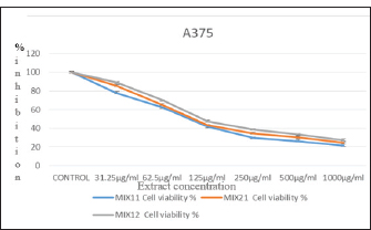Fig. 2. Antiproliferative activity of the combined extracts against the A375 cell line after 24 hours incubation at 37oC and 5% CO2.