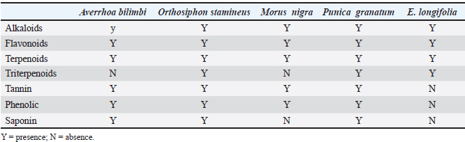 Keywords: Averrhoa bilimbi, Eurycoma longifolia, Morus nigra, Orthosiphon stamineus, Punica granatum.