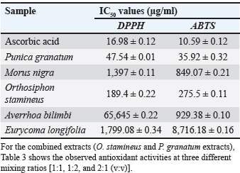 Table 3. Antioxidant activity of the combined extracts at varying ratios.