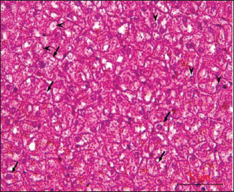 Fig. 7. Histological section of the kidney showing dilatation of renal tubular lumina (asterisk), with karyopyknosis of the lining epithelial cells (arrows), H&E,40x. Scale bar=5µm.