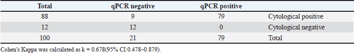 AbstractBackground: Hemomycoplasmosis caused by Hemotropic mycoplasmas, or Hemoplasma, which were previously classified as Eperythrozoon spp., are uncultivable parasites that infect the cell wall of erythrocytes in many susceptible mammals, including cattle, buffalo, goats, sheep, horses, cats, dogs, and even camels, and can be transmitted to humans. Aim: The purpose of the present work is to display and evaluate the different diagnostic criteria for detecting the most precise method for diagnosing Hemomycoplasma in horses. Methods: Different diagnostic methods were used to diagnose equine Hemomycoplasmosis caused by Mycoplasma haemofelis. Including cytological examinations (Giemsa stain blood smears and fluorescent microscopical diagnosis using acridine orange staining) as well as evaluation of the acute phase response reaction, Molecular diagnosis via quantitative polymerase chain reaction (qPCR), and postmortem examination of dead carcasses Results: cytological diagnosis revealed an infection rate of 88% (88/100), while the molecular diagnosis via qPCR confirmed infection in 79% (79/100) of the samples. The agreement between the two diagnostic methods was analyzed using Cohen's Kappa statistic. The observed agreement was 91% (91/100), and the expected agreement by chance was 72.04%. The calculated Kappa coefficient was κ=0.678 [95%, (confidence interval)], indicating substantial agreement between cytological and qPCR diagnoses according to the Landis and Koch benchmark. The findings also showed that infected horses exhibit significant differences in the acute phase response; additionally, dead carcasses displayed general emaciation, paleness of internal organs, obvious splenomegaly, and enlarged liver, kidneys, and heart, which showed white patches. Furthermore, histopathological changes indicate degeneration and necrosis in cardiac muscles, besides atrophic glomeruli, accompanied by the dilatation of renal tubules in the kidneys, as well as a marked reduction in the proportion of white pulp of splenic tissue and degenerative changes in the cytoplasm of hepatocytes, accompanied by nuclear alterations characterized by loss of chromatin content in the hepatic tissue. Conclusion: It was concluded that evaluating different tests for diagnosing equine Hemomycoplasmosis is very important to identify the most accurate one and use it confidently in the future. Additionally, although the diagnostic criteria and accuracy of each test vary, each test has its advantages and disadvantages. Moreover, Cytological diagnosis is still advised for field screening, whereas qPCR is for confirmatory diagnosis. Keywords: Acute phase response, Cytology, Equine diagnosis, Hemoplasma, qPCR. IntroductionHemomycoplasmosis caused by Hemotropic mycoplasmas, or Hemoplasma, which were previously classified as Eperythrozoon spp., are uncultivable parasites that infect the cell wall of erythrocytes in many susceptible mammals, including cattle, buffalo, camels, goats, sheep, horses, cats, dogs, and can be transmitted to humans (Saki, 2009; Constable et al., 2017). However, latent and mild infections can also be observed in deer, elk, and mules, where Hemoplasma spp. is species-specific (Messick, 2004; Tasker, 2020). The organism known to cause Hemotropic mycoplasmosis in all domestic and some wild animals leads to significant clinical disease, mainly characterized by hemolytic anemia, poor performance, and emaciation, as well as reduced productivity in livestock, ultimately resulting in death. The disease is found worldwide in various regions(Neimark et al., 2001). Nevertheless, it has been reported in different parts of Iraq (Jarad and Alsaad, 2016; Abed and Alsaad, 2017; Esmaeel and Albadranim, 2019). In horses, Hemomycoplasmosis is mainly caused by Hemomycoplasma haemofelis (Mycoplasma haemofelis). The organisms classified within the genus Mycoplasma are identified based on the 16S rRNA gene and RNase P RNA gene. According to Messick (2004) and Constable et al. (2017), a pleomorphic organism, which often appears as coccoid, rod, and ring shapes, invades the outer surface of red blood cells and is transmitted mechanically by arthropod parasites (Saki, 2009). In horses, the organism was identified in 1978 during a large and noticeable epidemic in Nigerian horses, and it was confirmed by molecular diagnosis in 2010, causing substantial economic losses (Dieckmann et al., 2012; Kinoshita etal., 2024; Ballados-González et al., 2025). Several diagnostic methods are used to identify the causative agent in suspected infected animals, including Giemsa or Romanowsky stains. Cytologic diagnosis of Hemotropic mycoplasma involves examining stained blood smears for bacteria on the surface of red blood cells (Stockham and Scottet, 2025). While this method can indicate infection, it is known to have low sensitivity and specificity, which could be due to cross-reactions, meaning it may miss infections or misdiagnose other conditions (Woronzoff-Dashkoff, 2002). Blood smears are examined for the visual presence of the causative organism. It should be noted that an experienced examiner can often distinguish between bacteria parasitizing the cell walls of red blood cells and other elements, such as Rickettsia, Anaplasma marginale, and the Howell–Jolly bodies (Stockham and Scottet, 2025). Fluorescence diagnosis of Hemotropic mycoplasma involves using fluorescent dyes to detect these microorganisms in red blood cells. Specifically, fluorescent dyes like Hoechst (this dye stains DNA and is commonly used to detect mycoplasma contamination in cell cultures, according to a resource) or DRAQ5 (this dye specifically targets nucleic acids and is used for detecting hemoplasmas in red blood cells) are utilized for visualization and quantification. Samples are observed under a fluorescence microscope to visualize the fluorescently labeled bacteria (Ciancaglini et al., 2005; Ligasová et al., 2019). Enzyme-Linked Immunosorbent Assay (ELISA) is a