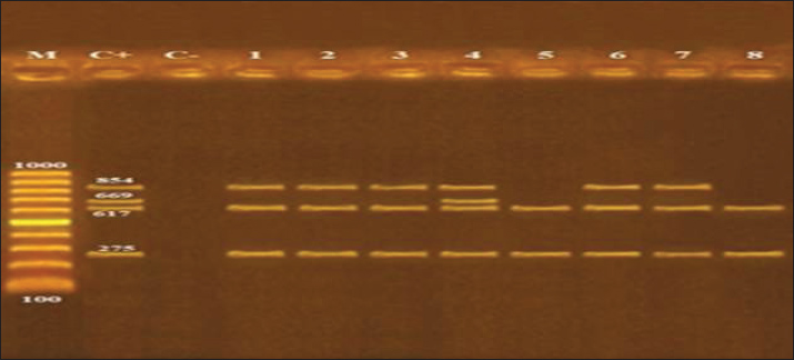 Fig. 1. Agarose gel electrophoresis of multiplex PCR of invA (275 bp), stn (617 bp), spvC (669 bp) and hilA (854 bp) virulence genes for characterization of Salmonella species. Lane M: 100 bp ladder as molecular size DNA marker. Lane C+: Control positive strain for invA, stn, spvC and hilA genes. Lane C-: Control negative. Lanes 1, 2, 3 S. Enteritidis; 6 S. Tsevie and 8 S. Anatum: Positive strains for invA, stn and hilA genes. Lane 4 S. Typhimurium: Positive strain for invA, stn, spvC and hilA genes. Lane 5 S. Rissen and 8 S. Takoradi: Positive strains for invA and stn gene. DiscussionA significant prevalence of Staphylococcus species is associated with meat contamination from surfaces that come into contact with meat, including floors, cutting boards, tables, and workers’ hands (Çetin et al., 2006). Camel muscle samples collected from Belbis city had a higher level of Staphylococcus contamination than liver and kidney samples from the same city. A highly significant difference at p value of 0. 05 was observed in the mean of Staphylococcus count in the examined camel samples from Abo Hammad city compared with samples from other cities. Bad hygienic practices of some workers, such as coughing, sneezing, and failure to follow health requirements during meat handling, make meat and meat products prone to contamination by pathogenic bacteria, such as S. aureus. Higher figures were obtained by Alaboudi et al. (2012), who investigated the prevalence rate of Staphylococcus in 147 camel meat samples collected from abattoirs and meat markets in Irbid Governorate, Jordan, and found that approximately 97.27% of the examined camel meat samples were contaminated by S. aureus. In addition, higher rates were recorded by Rahimi et al. (2013), who conducted a study on 50 camel meat samples from slaughterhouses in Isfahan, Iran. The bacteriological examination of the samples indicated that 46% of the camel meat was contaminated by S. aureus. Furthermore, Tegegne et al. (2019) conducted a study on 140 camel meat samples collected from slaughterhouses and retail shops and found that the mean ± SE of S. aureus was 6.19 ± 0.10 log10 CFU/g-1 and 6.33 ± 0.04 log10 CFU/g-1 in abattoir and retail shop samples. Results recorded by Ras (2019) who carried out a study on camel liver and kidney samples (10 from each) collected from Sharkia province, Egypt, and found that the mean count of S. aureus in camel kidney and liver samples was 4.2 ± 0.24 log10 CFU/g and 4.1 ± 0.15 log10 CFU/g, respectively were lower than those recorded in camel samples from Abo-Hammad city and then camel muscle samples from Zagazig and Belbis cities in the current study. Meanwhile, the mean counts in liver samples collected from Zagazig city were higher than those in liver and kidney samples collected from Belbis city in the current study. Naas et al. (2019) performed a study on 21 camel meat samples and found that from 5 (23.8%) selected isolates for S. aureus, only one sample (20%) was positive for S. aureus by partial sequencing of 16S rDNA. Besides, Gwida et al. (2019) conducted a study on 200 samples from camel meat and liver (100 for each) from Zagazig abattoir, Sharkia province, Egypt, and found that camel meat and liver samples were contaminated by S. aureus with a prevalence of 45% and 25%, respectively, with an overall incidence of 35%. Furthermore, Abdi Hassen et al. (2021) conducted a study on 68 raw camel meat samples from slaughterhouses and retail shops (34 samples each) in Nagelle town, Southern Oromia, Ethiopia, and recorded that the mean of S. aureus counts was 2.76 log10 CFU/g for abattoir samples and 3.07 log10 CFU/g for butchery samples. In addition, Salman et al. (2024) conducted a study on 100 camel meat samples collected from El-Basatien slaughterhouses in Cairo governorate, Egypt, and noticed that 24% of the examined samples were contaminated by S. aureus. The findings of the present work were in accordance with Abdal-Rudha et al. (2024), who performed a study on 35 camel meat samples from Najaf governorate/ Iraq, and revealed that S. epidermidis incidence in camel meat samples was 14.2%; meanwhile, S. aureus incidence in camel meat samples (14.2%) was lower than that recorded in the present study. Staphylococcal food poisoning can be caused by consuming foods or drinks that contain one or more preformed enterotoxins, which are categorized according to their antigenic properties: SEA, SEB, SEC, SED, and SEE (Pinto et al., 2005). Less than 1 mg of SE is required to produce drunkenness. When the amount of germs in food surpasses 100,000 /g, we approach this toxic level. For those who are really sensitive, even 100–200 ng of enterotoxin can trigger symptoms. Hospitalization may be necessary depending on the severity of the illness (Bennett 2012). Staphylococcal food intoxication is most commonly caused by eating meat with sufficient levels of one or more preformed enterotoxins. According to Argudín et al. (2010), SEA stands out as the leading cause of Staphylococcal food poisoning worldwide among the several enterotoxins produced by S. aureus. Rahimi et al. (2013) also discovered that of 23 camel meat samples from Isfahan, Iran, four S. aureus isolates 17 %) produced Staphylococcal enterotoxins, one for each of the four types A, B, C, and A C. Alaboudi et al. (2012) tested 58 S. aureus isolates from camel meat samples in Jordan’s Irbid Governorate for enterotoxigenicity and found higher quantities. A total of 41 isolates (70.7% of the total) were determined to have Staphylococcus enterotoxigenic genes. Further information was gleaned from the fact that the SEA toxin gene ranked highest, followed by the SEA+SEB and SEC genes. No evidence of SEE or SED genes was found in any of the samples. Ras (2019) discovered that S. aureus isolates from camel liver and kidney samples taken from the Sharkia abattoir in Egypt contained Staphylococci enterotoxins. A total of 69.2% of the examined S. aureus isolates were foun