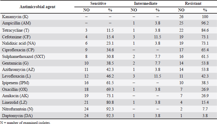 Camel meat isolates were tested for antimicrobial susceptibility profile (n=26). Data declared that all isolates were resistant to kanamycin (100%). Staphylococcus aureus isolates had high resistance against ampicillin (96.2%), tetracycline (84.6%), cefotaxime (73.1%), nalidixic acid (73.1%), ciprofloxacin (65.4%), and sulphamethoxazole (61.5%). Staphylococcus aureus isolates were highly sensitive to nitrofurantoin and daptomycin (92.3%), linezolid (80.8%), amikacin (73.1%), oxacillin (69.3%), and ipipenem (61.5%) (Table 3). Table 3. Antimicrobial susceptibility of Staphylococcus aureus isolated from the examined camel meat samples (N=26).