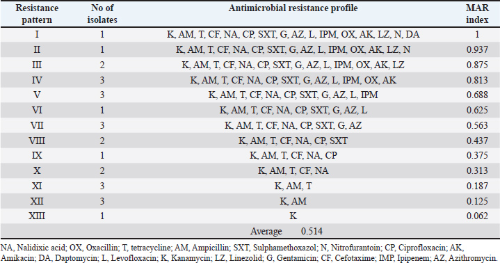 The results clarified that the antibiotic resistance profile of the identified S. aureus isolates to sixteen antibiotics and revealed 13 resistance patterns with a high number (22) of Multidrug resistance S. aureus isolates, with a percentage of 84.6% (Table 4). Table 4. Antimicrobial resistance profile (MAR index) of Staphylococcus aureus isolated from the examined camel meat samples (N=26).