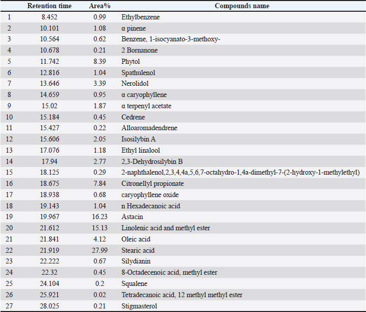 DiscussionA healthy liver is central for metabolism, nutrient absorption, and detoxification, all of which directly affect an animal’s weight, appetite, and health status (Tharwat, 2020). Milk thistle is a very important plant because it contains highly effective active ingredients (Aida et al., 2022; Amjad et al., 2024). Our analysis of the components of milk thistle seeds aligned with previously reported findings, indicating that milk thistle contains a variety of secondary metabolites, including flavonoids, terpenoids, tannins, saponins, alkaloids, and steroids (Yurdakok-Dikmen et al., 2018; Rasha Eldalawy et al., 2022). The most important components for liver function in the extract were 2,3-dihydrosilbin B, silydianin, and Isosilybin A (Karimi et al., 2011; Fried, 2012; El-Far et al., 2018). These compounds, all classified as flavonolignans, are responsible for the antioxidant, anti-inflammatory, and liver-protective properties of silymarin (Poltavets et al., 2021). However, the terpenoids, including nerolidol, spathulenol, α caryophyllene, and squalene in the extract which are considered natural antioxidants that support cellular health (Rasha Eldalawy et al., 2022). Moreover, casticin was present at a high level in our extract and could have potential benefits in the attenuation and treatment of liver fibrosis (Zhou et al., 2017). Previous studies on other animal species, such as the one by (Tedesco and Guerrini, 2023), have also reported that milk thistle can lead to enhanced animal performance and health status (Garavaglia et al., 2015; Janocha et al., 2021; Gousias et al., 2025). Similar results for improvements in weight gain, health score, and appetite in our study were reported by (Hashemi Jabali et al., 2018; Amjad et al., 2024; Gousias et al., 2025), which support the benefits of milk thistle extracts in animals suffering from liver problems. Similar results of lymphocytosis in animals after silymarin treatment have been reported previously (Lukanov et al., 2018; Mohammed et al., 2022). These changes suggest that milk thistle has a positive impact on the immune response and overall blood health (Wilasrusmee et al., 2002). Previous research on the effects of milk thistle on animal hematological parameters is varied. A review by (Tedesco and Guerrini, 2023) indicated that milk thistle can influence blood parameters, whereas other studies have shown changes in blood parameters (Mohammadi et al., 2019; Ahammad et al., 2024; Imbabi et al., 2024; Cong et al., 2025). Although direct comparisons to camel studies are limited, our results align with the general understanding that silymarin, the active compound in milk thistle, possesses properties that can modulate physiological responses, including those related to blood immunity parameters. The improvement in lymphocyte and monocyte percentages, coupled with a decrease in neutrophil percentage in the present study, could indicate a decrease in inflammatory processes associated with liver dysfunction (Del Campo et al., 2018). These values are much closer to those of the control group, indicating that the milk thistle extract exerts a hepatoprotective effect. However, Tedesco et al. (2004) demonstrated that silymarin improved liver function in periparturient dairy cows by reducing oxidative stress and normalizing enzyme activities. Moreover, a review by (Vargas-Mendoza, 2014) the ability of silymarin to protect against many toxic models of experimental liver diseases in laboratory animals. Other biochemical parameters, such as TP and ALB, decreased in affected animals compared to healthy animals, while these parameters improved closer to normal values after treatments, which was in agreement with Sun et al. (2019), who reported a decrease in albumin in patients with liver dysfunction. This is a positive indicator because albumin is synthesized in the liver and its levels often reflect the capacity of the liver to synthesize it. The improvement in total protein and albumin levels in diseased camels after silymarin treatment, which is consistent with weight gain and improved appetite, has been reported in previous studies (Eminzade et al., 2008; Dockalova et al., 2021; Ghazaghi et al., 2024). The observed increase in TP and ALB suggests an improvement in the liver’s synthetic function, further supporting the hepatoprotective effects of milk thistle extract, similar to its effects in other species (Tedesco et al., 2004; Dockalova et al., 2021; Amjad et al., 2024; Dhande et al., 2024; Lambo et al., 2024). While the study provides compelling evidence for the therapeutic benefits of milk thistle extract in dromedary camels, some limitations should be acknowledged. The sample size was relatively small, particularly for the healthy control group. Future studies with larger cohorts and longer treatment durations would provide more robust data. Additionally, exploring different dosages and formulations of milk thistle extract could optimize its therapeutic efficacy. Further research could also delve into the specific mechanisms by which each identified phytochemical constituent contributes to the overall therapeutic effect. ConclusionIn conclusion, the current study provides promising data on milk thistle in dromedary camels. Our data provide important evidence for the therapeutic efficacy of milk thistle extract in dromedary camels with liver disorders. The observed improvements in clinical scores, hematological parameters, and biochemical markers highlight the hepatoprotective, anti-inflammatory, and immune modulating properties of the hepatocytes. These findings support the use of milk thistle extract as a natural and effective intervention to improve liver health and overall well-being in camels. Further research is warranted to fully elucidate the underlying mechanisms and optimize its application in veterinary practice. AcknowledgmentsThis work was supported by the Deanship of Scientific Research, Vice Presidency for Graduate Studi