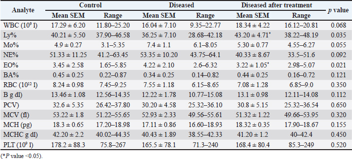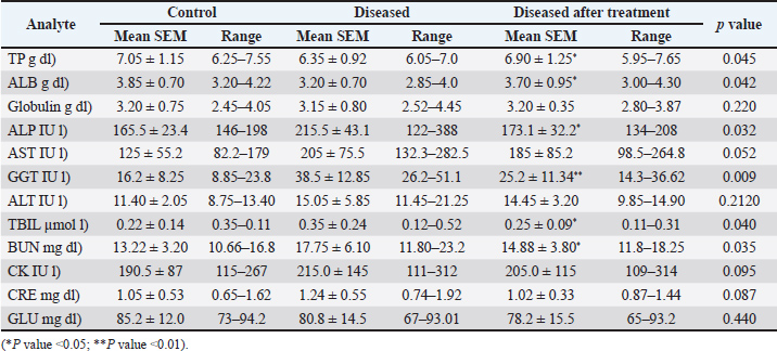 Table 3 presents the biochemical parameters in control, diseased, and post-treatment camels. Specifically, ALP increased from 165.5 ± 23.4 IU/l in control to 215.5 ± 43.1 IU/l in diseased camels, GGT from 16.2 ± 8.25 IU/l to 38.5 ± 12.85 IU/l, TBIL from 0.22 ± 0.14 µmol/l to 0.35 ± 0.24 µmol/l, and BUN from 13.22 ± 3.20 mg/dl to 17.75 ± 6.10 mg/dl. After 42 days of milk thistle treatment, a significant improvement was observed in these liver enzymes. ALP decreased to 173.1 ± 32.2 IU/l, GGT to 25.2 ± 11.34 IU/l, TBIL to 0.25 ± 0.09 µmol/l, and BUN to 14.88 ± 3.80 mg/dl. Table 3. Mean, standard error of the mean, and range of biochemical parameters in control and diseased camels before and after 42 days of treatment with milk thistle extract. p values calculated between parameters in diseased camels before and after treatment.
