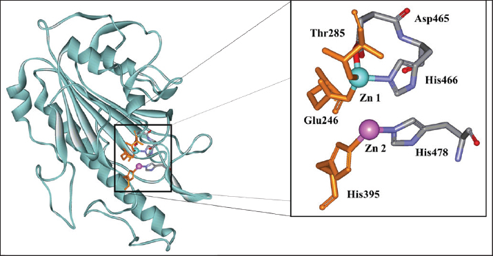 Fig. 1. MRC1 3D structure (pdb code: 5GRR) and Zn 1 and Zn 2 binding residues (catalytic residues shown in orange). The docking analysis of the compounds identified in the ethanolic extract of thornless O. ficus indica was compared with the docking profile of two standard inhibitors (eugenol and tetrandrine) reported in a previous study as MRC-1 inhibitors (Wang et al., 2018; Yi et al., 2022). These two molecules were docked using the same parameters as the docking of our compounds. The results showed that the binding led to the affinity of the corresponding compounds in the active sites of MRC-1. The binding energies of the identified compounds in (OFI0), eugenol, and tetrandrine are presented in Table 4. Table 4. The binding energies of specific compound from the ECE of OFI0, Eugenol and Tetrandrine with MRC1.