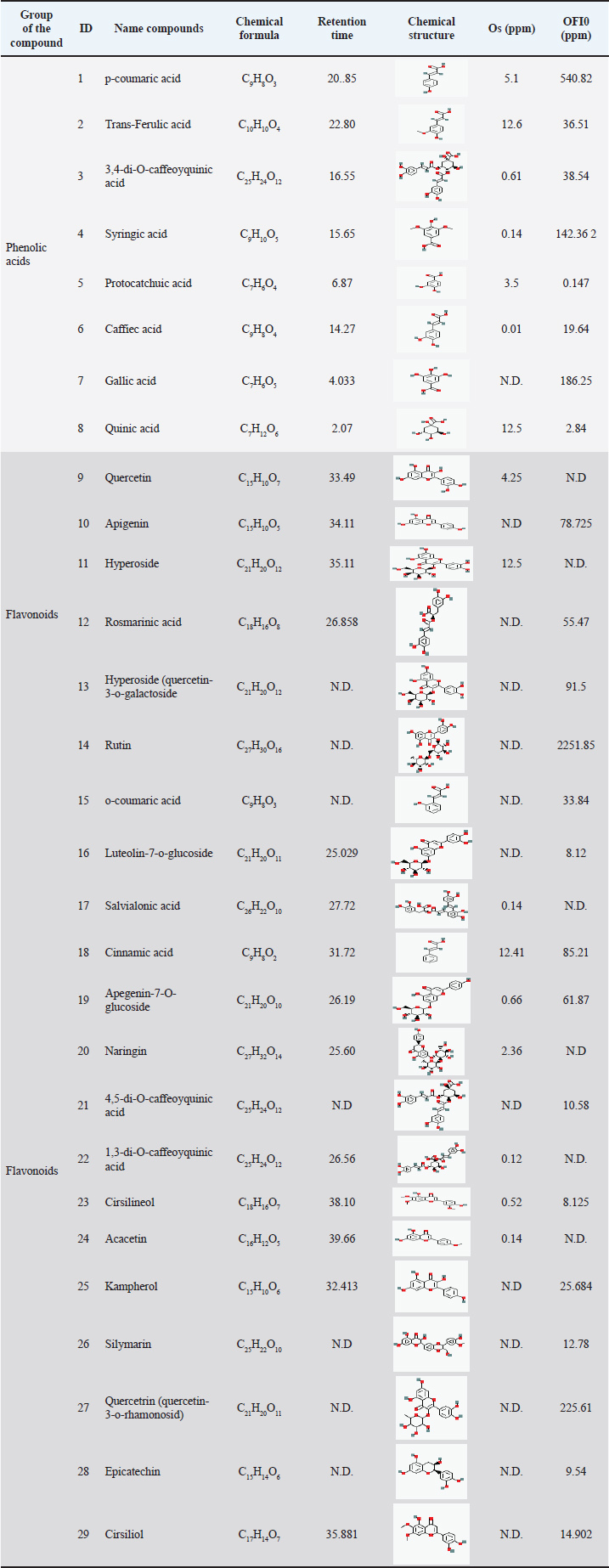 The total phenolic content of ethanolic extracts was expressed as GAE/g (mg), whereas the total flavonoid and tannin contents were expressed as CAT/g (mg). The ECE of O. streptacantha extracts showed the highest phenolic acid, flavonoid, and tannin contents. The obtained results indicate that the ECEs of Os and OFI0 were not significantly different (p ≤ 0.05) in terms of total phenolic content at a concentration of 112.00 mg GAE/g and 98.33 mg CAT/g. The flavonoid contents ranged from 51.67 mg CAT/g in the ECE of OFI0 to 64.67 mg CAT/g in the ECE of Os, with no significant difference observed (P ≤ 0.05). Tannin content ranged from 0.093 mg CAT/g in the ECE of OFI0 to 0.408 mg CAT/g in the ECE of Os. LC-ESI-MS analysis of O. streptacantha and thorn-less O. ficus indicaLC–ESI–MS analysis identified phenolic acids and flavonoids in the ethanolic extracts of O. streptacantha and thorn-less O. ficus-indica (Table 2). A total of 29 compounds were identified, including 8 phenolic acid compounds and 21 flavonoid molecules. Under ESI conditions, all analytes exhibited higher sensitivity in the negative mode. Among these phenolic acids, p-coumaric acid was the most abundant compound in the ethanolic extract, with the highest concentration in OFI0 compared to Os (540.82 ppm and 5.1 ppm, respectively), followed by gallic acid with a concentration of 186.25 ppm registered in OFI0, which was undetectable in Os. In terms of flavonoid contents, rutin exhibited the highest concentration in the ECE of OFI0 (2,251.85 ppm) and was undetectable in the ECE of Os, followed by quercetin-3-o-rhamonosid (225.61 ppm), which was also undetectable in the ECE of Os. Apigenin was not detected in the ECE of Os. Table 2. Chemical composition of ECEs for two types of Opuntia from Libya.