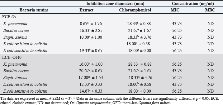 Biological activitiesMIC and MBC antibacterial activities of O. cladode extractsThe antibacterial activity of the O. cladodes extracts was assessed using the agar diffusion method. The microorganisms examined in this study are among the most significant human and animal pathogens known to cause contamination, food spoilage, and foodborne diseases (Eshamah et al., 2020). The inhibition zones ranged from 8.67 to 20.67 mm (Table 3). Significant differences in inhibition zones were observed between the ECEs (p ≤ 0.05). Both extracts exhibited similar antibacterial activity against S. aureus (SA121) and B. cereus (BC7), with inhibition zones of 16.33 ± 2.85 mm and 10.00 ± 1.00 mm for O. streptacantha, and 20.67 ± 0.67 mm and 17.00 ± 1.53 mm for thorn-less O. ficus-indica, respectively. These results were comparable to the positive control (chloramphenicol: 18.33 ± 3.67 mm and 21.67 ± 0.67 mm, respectively). Table 3. Antibacterial activities MIC and MBC for Opuntia species cladode extracts.