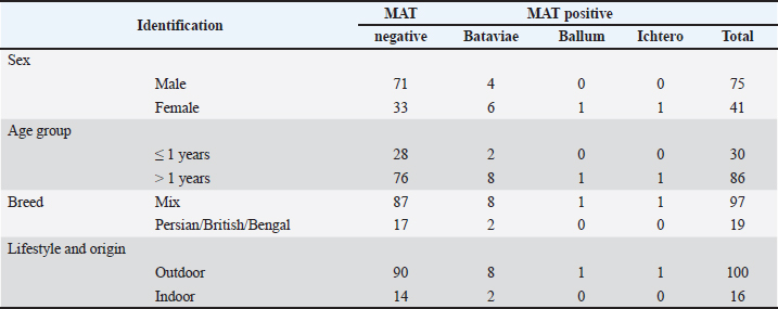 AbstractBackground: Leptospirosis is a zoonotic disease caused by pathogenic Leptospira spp., which can infect a wide range of mammalian hosts. Transmission to humans occurs not only from rodents and wildlife but also from companion animals, such as cats, living in close contact with humans. The occurrence and clinical expression of leptospirosis in animals vary according to species, age, immune status, and serovar infection. In this context, cats may represent an underrecognized component in the epidemiology of leptospirosis in endemic areas. Aim: This study aimed to estimate the seroprevalence of leptospirosis in cats, identify circulating Leptospira serovars, and descriptively characterize clinical signs and selected renal and hepatic laboratory findings in naturally exposed cats in Sleman Regency, Indonesia. Methods: A total of 116 pubertal cats from Sleman Regency, Special Region of Yogyakarta, Indonesia, were clinically examined. Three millilitres of blood were collected for the MAT, routine hematology, and biochemical analyses, including renal biomarkers [blood urea nitrogen (BUN), creatinine, symmetric dimethylarginine, hepatic biomarkers alanine aminotransferase (ALT), aspartate aminotransferase (AST), total bilirubin, albumin, and globulin], and the inflammatory marker feline serum amyloid A (fSAA). Leptospirosis was diagnosed at a MAT titer ≥1:100 against 14 Leptospira serovars. The seropositivity or infection rate was calculated as the proportion of MAT-positive samples, which represents prior exposure or infection rather than clinical disease. Results: Of the 116 cats, 12 (10.34%) were seropositive for leptospirosis. Serovar Bataviae was predominant (83.34%), while Ballum and Icterohaemorrhagiae each accounted for 8.33%. Most seropositive cats (66.67%) were clinically normal at the time of sampling, whereas 25% showed nonspecific signs such as anorexia, fever, icterus, lethargy, vomiting, or diarrhea. One cat (8.33%) presented with clinical signs consistent with renal involvement. The hematological parameters were within the reference ranges in more than half of the seropositive cats (58.33%), whereas leukocytosis indicative of inflammation was observed in 25% and mild anemia in 16.67%. Renal biomarkers (BUN, creatinine) remained within the reference intervals in 91.67% of seropositive cats, indicating minimal renal involvement at the time of sampling. Hepatic alterations were more frequently observed, with elevated ALT and AST levels in 25% of cats and increased total bilirubin or altered albumin-to-globulin ratios in 41.67% of cats. Elevated fSAA concentrations were detected in 33.33% of seropositive cats, indicating subclinical inflammatory responses. Conclusion: This study demonstrates the presence of feline leptospiral exposure in Sleman Regency, with a seroprevalence of 10.34%, predominantly associated with Leptospira interrogans serovar Bataviae. Although most infections were subclinical, variation in clinical and laboratory findings among seropositive cats highlights the heterogeneous nature of feline leptospirosis. The detection of pathogenic serovars in outwardly healthy cats indicates an epidemiological role for cats as subclinical carriers, underscoring the need for surveillance and the integration of feline leptospirosis monitoring within a One Health framework. Keywords: Cats, Indonesia, Leptospira interrogans, One Health, Serovar Bataviae. IntroductionLeptospirosis is a zoonotic disease caused by Leptospira Gram-negative bacteria. It is transmitted through contact with the urine of infected animals or with Leptospira-contaminated environments (Murillo et al., 2020). Leptospirosis has a wide geographic distribution; warm air, moist/wet soil, and alkaline pH are suitable climates for Leptospira development. The incidence of leptospirosis is 100 times higher in tropical countries than in subtropical countries (Adler and De La Peña Moctezuma, 2010). Leptospirosis can be classified as pathogenic Leptospira based on the structural heterogeneity of lipopolysaccharide surface molecules; more than 300 serovars grouped into 24 antigenically related serogroups have been identified (Davignon et al., 2023). This means that animals previously infected with only one serovar have immunity against that specific serovar. The dominant Leptospira serovar in one region may differ from that in other regions (Chadsuthi et al., 2017). Cats are susceptible to Leptospira spp. infection; however, many seropositive cats show no clinical signs and are therefore not recognized as reservoir hosts. The clinical signs of feline leptospirosis include anorexia, lethargy, dehydration, weight loss, polyuria and polydipsia, vomiting, hematuria, uveitis, lameness, ascites, and hepatomegaly (Arbor et al., 2012). Some cats with antibodies against Leptospira species have kidney disease-related signs and histopathological evidence of renal inflammation (Schuller et al., 2015). Despite increasing reports of feline leptospirosis worldwide, data from Southeast Asia remain scarce, and no previous studies have documented the serovar-specific pathogenicity of Leptospira interrogans in cats in Indonesia. Leptospira spreads through the bloodstream after penetrating through the skin/mucosa (leptospiremia phase). Primary lesions develop in the endothelium of small blood vessels; in the liver, they attach to the endothelial lining of hepatic sinusoids and invade hepatocytes, resulting in jaundice and liver dysfunction, with varying degrees of severity among species (more severe in dogs and humans, relatively mild in cats). Leptospira causes local ischemia in the kidneys, leading to tubular necrosis (Adler and De La Peña Moctezuma, 2010). Renal colonization occurs in most infected animals because the bacteria replicate and persist in the renal tubular epithelial cells. This process causes cytokine release and inflammatory cell recruitment, which triggers nephritis (Craig et al., 2015; Murillo, et al., 2020). C