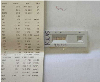 Fig. 1. Commercial test kit showing positive results for Leptospira sp. and serum biochemistry result strip at day 3. By September 12 (day 4), dexamethasone was discontinued and replaced with tolfenamic acid. The treatment remained the same for the next 4 days. By September 14 (day 6), clindamycin administration was stopped. By September 17 (day 9), all medications were continued except for metoclopramide. Enalapril and amlodipine were also given on this day. By September 18 (day 10), the patient was gradually weaned off most medications, receiving only oral doxycycline, liver and anti-anemia supplements, and injectable omeprazole, procaine, and benzathine penicillin. The same medications were given the next day, September 19 (day 11), with the addition of enalapril and amlodipine. The owner opted for additional tests. On September 20 (day 12), blood samples were obtained from the patient and sent to another veterinary clinic (GPY Veterinare Animale, Cebu City, Philippines) for PCR testing. The in-clinic PCR test (AimBio) revealed negative results for Ehrlichia canis, Anaplasma platys, Babesia canis, Babesia gibsoni, Mycoplasma haemocanis, and Hepatozoon sp. (Fig. 2) but positive for Rickettsia sp. (Fig. 3). Another fraction of the blood sample was further processed for DNA extraction and tested using standard PCR utilizing the gltA gene (Satoh et al., 2002) at the Institute for Molecular Genetics, Parasitology, and Vector-borne Diseases, Cebu Technological University, Cebu City, Philippines. Sequencing or species-level identification was not performed. PCR results revealed a positive band at the expected length (341 BP) (Fig. 4). A positive control was not included in the standard PCR run because Rickettsia DNA was unavailable at the local laboratory, which is a limitation of the test. However, the clear amplification of a band of appropriate size (341 bp) for the gltA gene is robust, supportive evidence. Contamination was also ruled out, as the negative control remained negative.